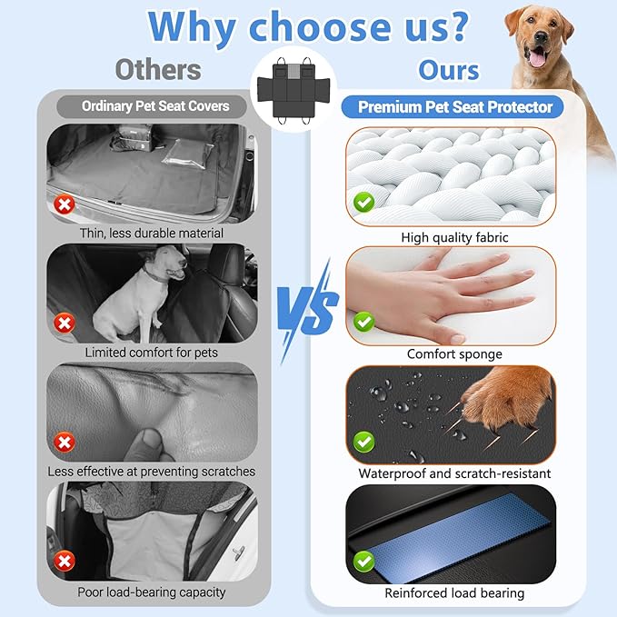 - UNIVERSAL FIT WITH SEAT BELT OPENINGS & STORAGE POCKETS: Includes built-in seat belt openings compatible with dog harnesses and child car seats. Two storage pockets keep leashes, toys, and treats organized—so your back seat stays tidy and your pet happy.
