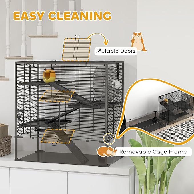 - Easy Cleaning and Access: The big hamster cage's frame attaches to the glass bottom with clips, making disassembly quick and cleaning hassle-free. Two front doors and a top opening provide easy access to your pet.