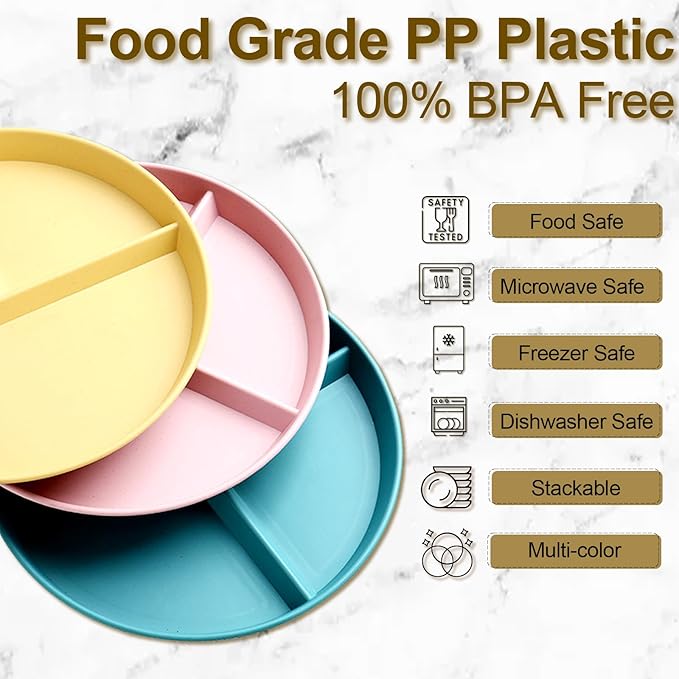 Divided Plates for Adults (8 Packs), Unbreakable Portion Control Plate Sectioned with Dividers, 9 Inch Plastic Food Separator Dinner Plates Lightweight Compartment BPA Free Reusable Microwave Safe