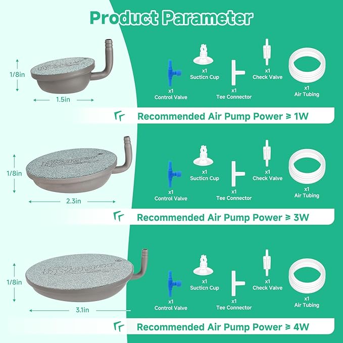 - Complete Air Stone Kits: This fantastic aquarium air stone kit includes a 3.1 inch nano air disk stone, 1 control valve, 1 check valve, 1 suction cup, 1 T-shaped connector, 1 4mm standard ait tubing. Recommended air pump power: ≥ 4 W. PS: The deeper the water, you may need to use a larger wattage air pump to drive it. soak the stone completely in water for 1 hours before use; clean it with a brush after a period time of use.