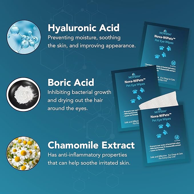 NOVEHA Dog Eye Wipes, Gentle Tear Stain Remover, Eye Hygiene, and Allergy Relief (60 Counts)