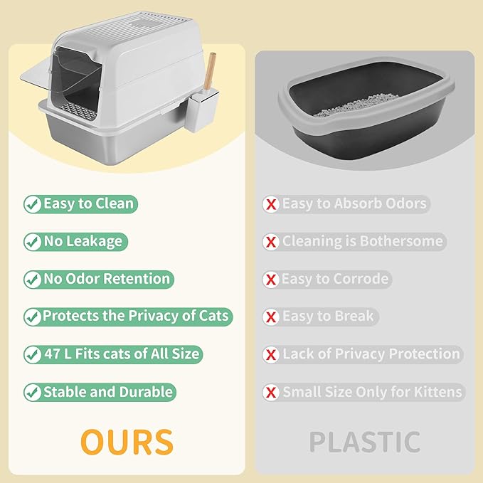 - 【Leak-Proof Stainless Steel Cat Litter Box】Our enclosed cat litter boxes is interior is equipped with a sloped anti - leak plate and a seamless connection design. This not only ensures that urine is completely contained within the box, preventing any leakage through gaps, but also stops litter from scattering. Whether your cat has a large urine volume or is an active digger, our litter box provides a mess - free solution.