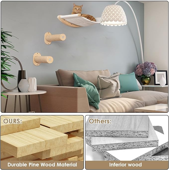 - Sturdy and Safe: The wall mounted cat furnure is made of solid wood, which is very sturdy and durable. Including cat wall-mounted hammock and 2 high-grip Cat Wall Steps , the thickness of the solid wood design ensures the safety of cats. Let your cat enjoy playtime and satisfy your indoor cat's nature of climbing and staying in high places
