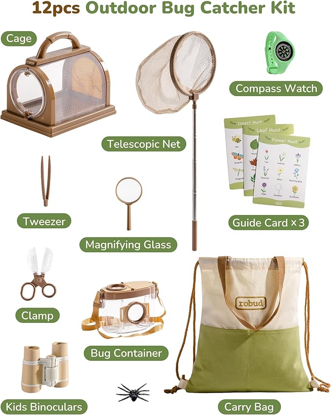 - 【All-in-One Adventure Kit】 This comprehensive set includes a magnifying glass for compass watch*1, kid binoculars*1, bug container*1, guide card set*1, cage*1 , telescopic net*1, clamp*1, tweezer*1, magnifying glass*1 and portable bag*1. It has everything kids need to dive into exciting outdoor adventures.