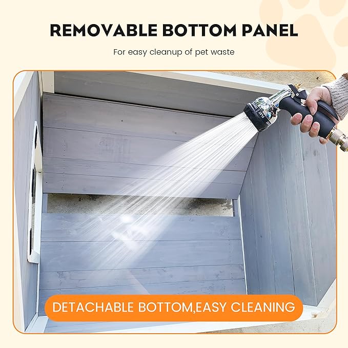 - [Specially Designed for Outdoor Use] The sloping asphalt roof is expertly engineered to prevent rainwater from pooling, ensuring that your pet's living space remains dry and comfortable. The floor is 2.4’’ above the ground, and there is a removable PVC curtain and adaptable floor pads for uneven ground. This design enables the dog house to withstand harsh weather conditions, preventing water from seeping in and materials from getting damp