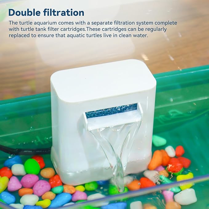 - 【Standalone Filtration System】 The turtle aquarium comes with a separate filtration system complete with turtle tank filter cartridges. These cartridges can be regularly replaced to ensure that aquatic turtles live in clean water.