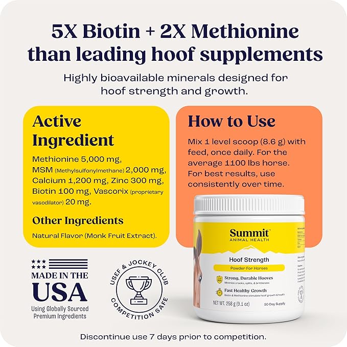 - 5X Biotin & 2X Methionine for Superior Hoof Health – Outperform leading hoof supplements with 5X more Biotin and 2X more Methionine per scoop, promoting consistent hoof growth and fortifying hoof walls to prevent cracks and brittleness.
