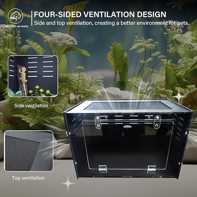 - Transparent Front for Easy Observation of Pet Activity The transparent front panel of this reptile enclosure allows you to easily observe your pets’ behavior and health. Whether it's a jumping spider enclosure or a reptile terrarium, you can always keep an eye on your pets' well-being and make sure they're thriving in a safe and comfortable environment.