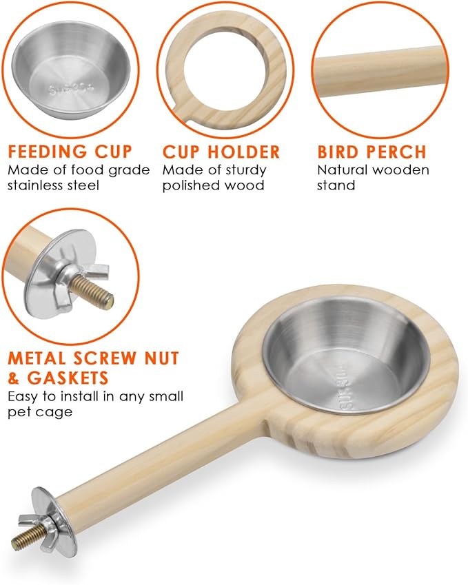 - FEEDING CUP & PERCH: KATUMO bird food bowl and wooded perch are combined in one, suitable for parakeet, canary, conure, lovebird, budgie and more small pets. Your bird will surely love to sit on the rim or the wood perch for rest after feeded