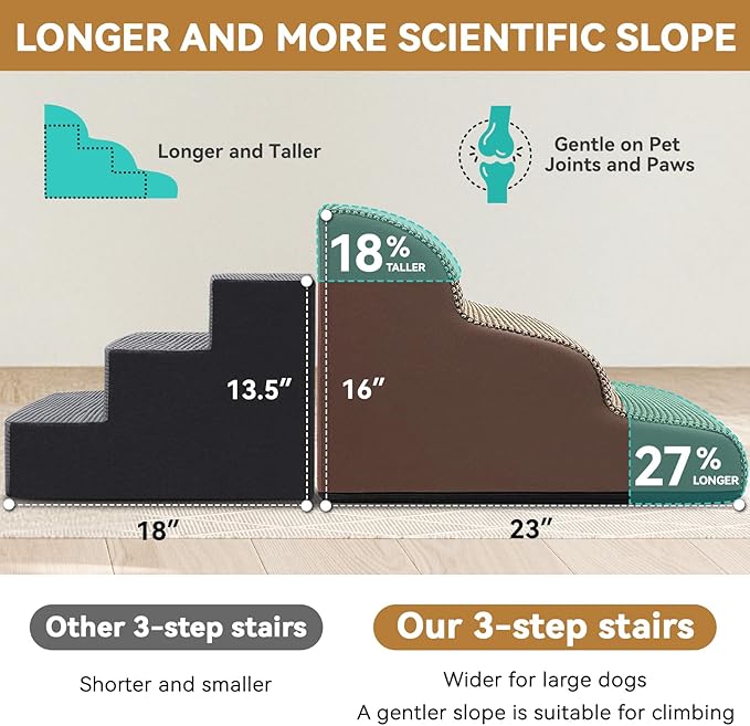 - Specific & Durable Design: Low angle slope design reduces the pressure on joints when pets jump up and down from high bed, sofa, chair and car. Portable handle makes moving stairs easily at home or taking a trip with your pet. The non-slip bottom keeps the stair firmly planted on the ground. No more worrying about your pet slipping and getting hurt! Our foam stair is an essential part of your beloved pet's life! It combines functionality, safety, and durability in one stylish package!