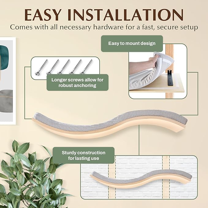 - EXTRA LARGE SHELF- The S-shaped climbing frame measures 35.4” (L) x 11.6” (W) x 2” (T), providing ample space for your cat without taking up valuable floor space. This space-saving wall-mounted cat shelf has a unique design that offers a modern, stylish look and seamlessly blends with your home décor. Perfect for those looking for floating cat shelves or cat wall furniture to save space.
