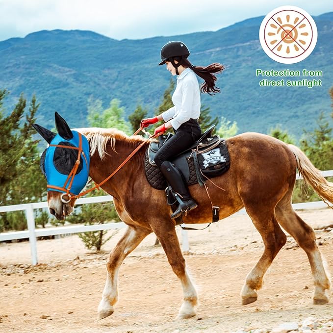 Horse Fly Mask with Ears, Comfortable Fit Stretch Fabric with UV Protection Soft on Skin Breathability for Small/Medium Size Horses (Blue)