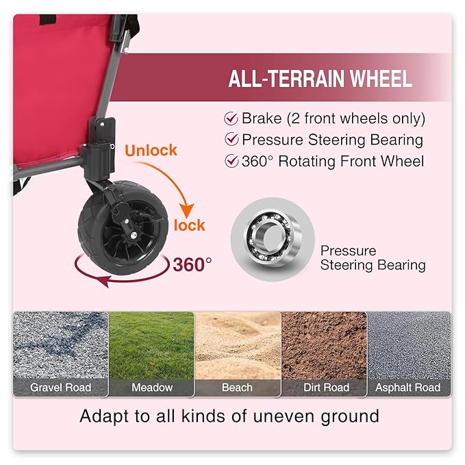 - Flexible Design for Outdoor: Our upgraded dog wagon cart is equipped with 4 all-terrain wheels with bearings, which can smoothly tow and easily transport on multiple ground. 2 rotating front wheels with brakes ensure parking at all times while playing with pets. Adjustable handle with locking system can hold it in place.