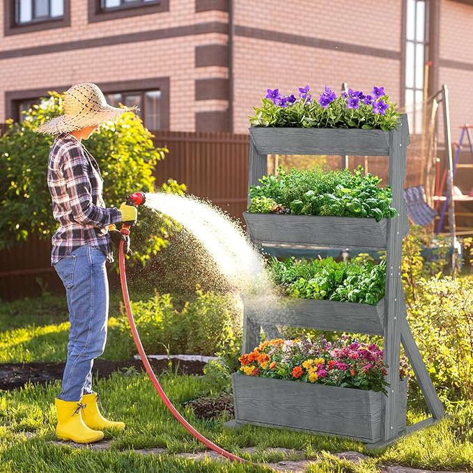 SUNYRISY 4 Tiers Vertical Raised Garden Bed Outdoor Planter Tower, Wooden Freestanding Planter Box for Planting Herbs Flowers Vegetables Backyard Patio Balcony Indoor Outdoor Gardening, Grey