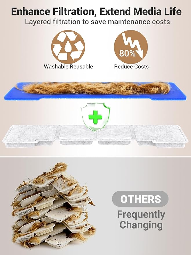 - 5-Layer Filtration:The dog water fountain 4-layer filtration system with an additional filter sponge effectively captures dust, hair, and odors, ensuring clean and healthy drinking water for your dog