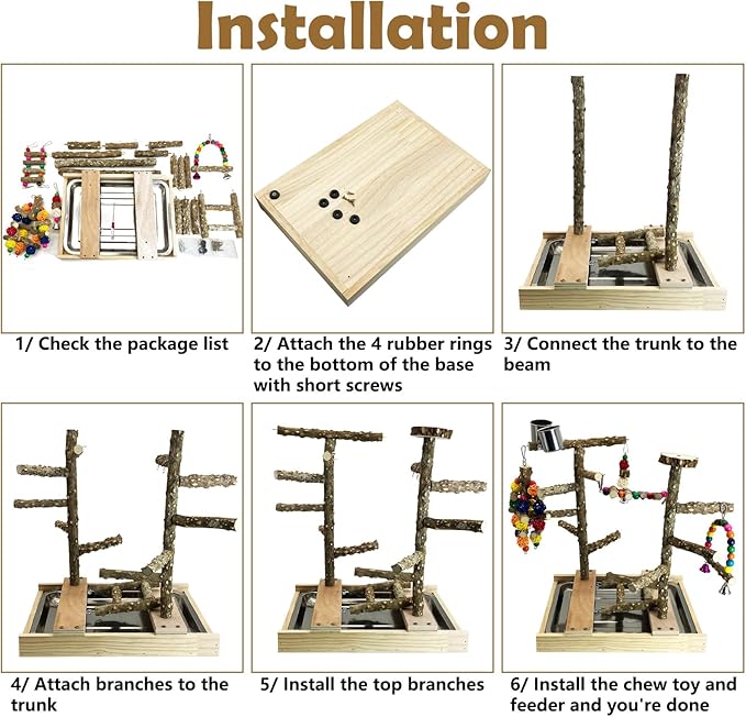 - EASY TO ASSEMBLE AND CLEAN: This wooden parrot play stand has a simple design; you can easily use screws to secure the perch; we put a small screwdriver in the package for assembly; the r-emovable tray allows for quick cleaning of droppings and debris; simply wipe the perches with a damp cloth; then let them dry in the sun; ensuring a h-ealthy and hygienic environment for your bird