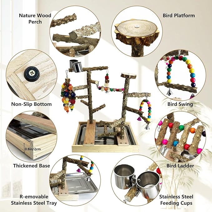 Tfwadmx Bird Playground Natural Wood Bird Play Stands Parrot Perch Stand with Removable Tray Climb Ladders Swing Chewing Toys for Lovebirds Cockatiels Budgies