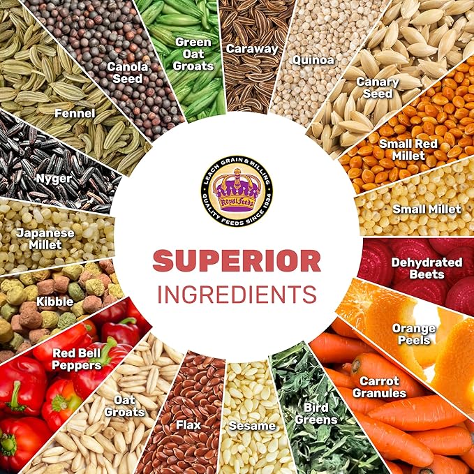 - ππππ ππππ ππππ πππππππππππ β Made with a carefully selected blend of whole grains, seeds, and dried vegetables, including quinoa, canary seed, millet, flax, and nyjer, to provide essential nutrients. A variety of textures and flavors keeps birds engaged and encourages healthy eating habits.