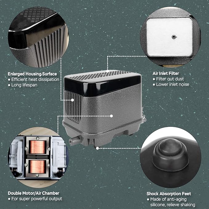 - IMPROVED HEAT DISSIPATION - The enlarged housing surface provides superior heat dissipation, keeping the pond air pump running stably. Perfect for continuous 24/7 operation in ponds, hydroponic air pump systems, or wastewater treatment.