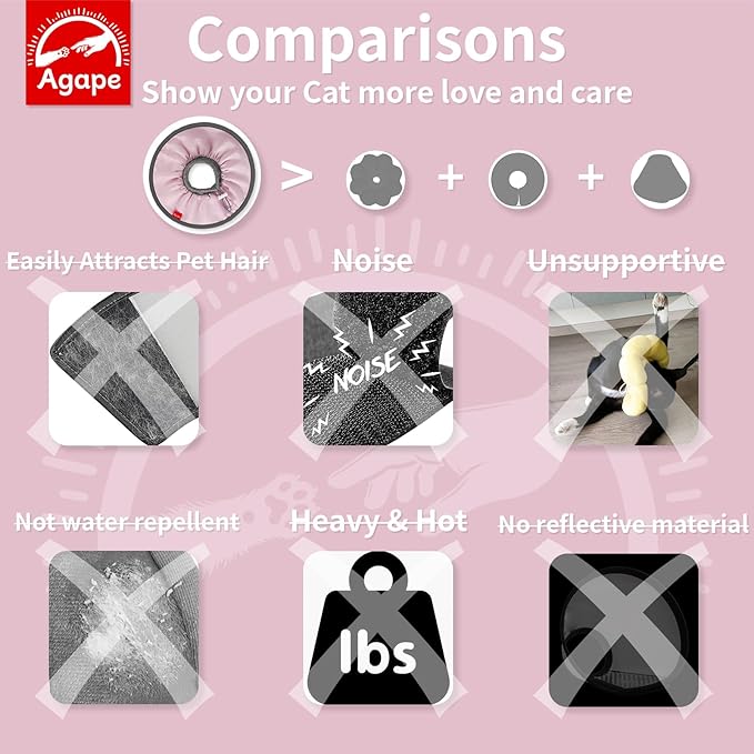 - 【Enhanced Protection & Freedom】The Agape Cat Recovery Collar features a 304 stainless steel support ring and a larger diameter, addressing the issue of insufficient protection found in some collars that are too soft or too small. This design ensures your cat can eat, drink, and play freely, without blocking their vision, allowing them to maintain their usual activities and comfort during recovery (Please note: While using the collar, it may affect your cat's ability to enter a closed litter box or cat door)