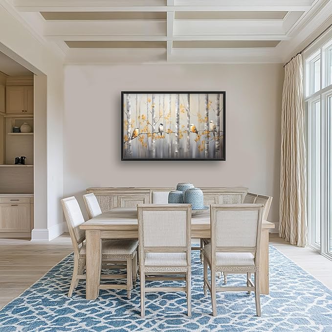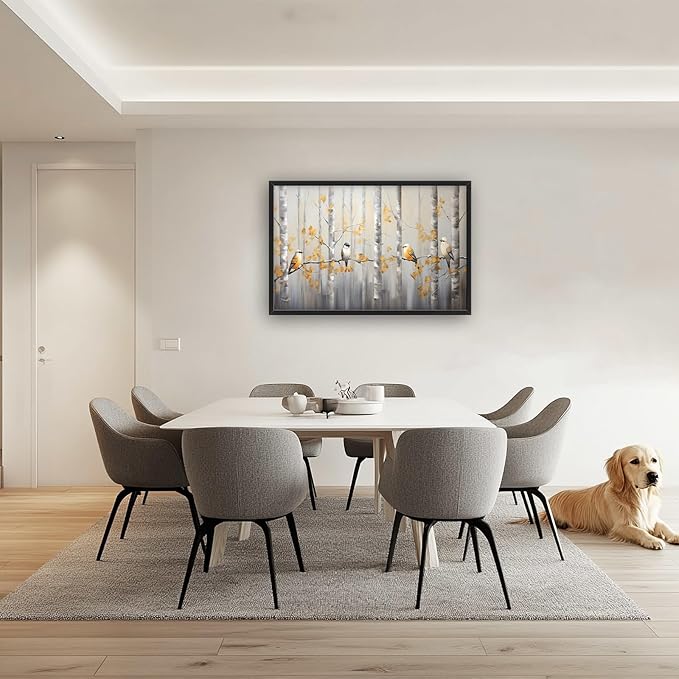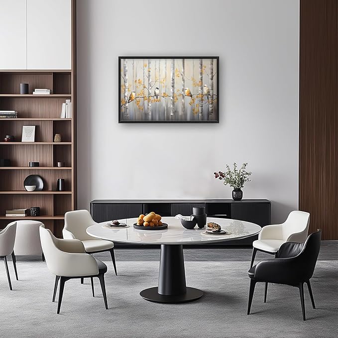 - 【Unique Design】Abstract painting of silver birch trees with birds, yellow leaves, white background, gold accents, soft lighting, neutral tones, modern style, wide frame, oil on canvas, brush strokes, elegant composition, nature-inspired artwork.