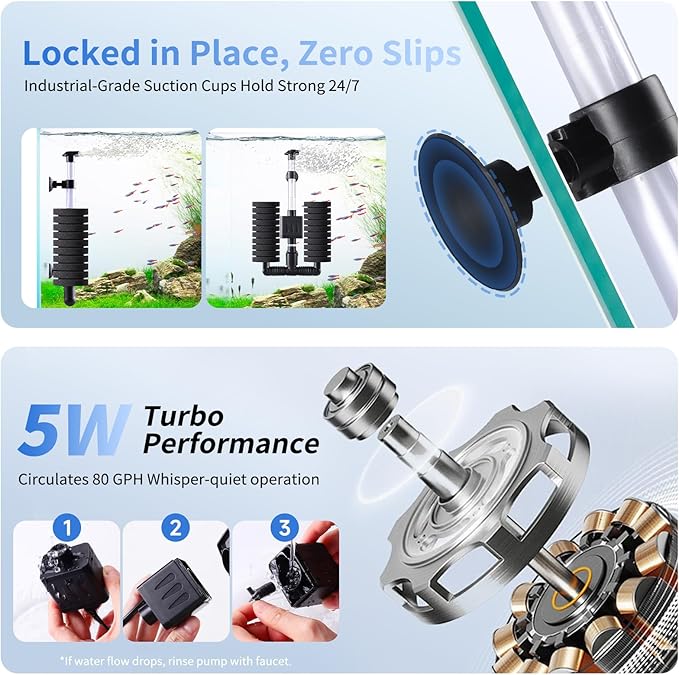 - Dual-Action Filtration System: Micro-porous sponge physically traps debris while nurturing beneficial water. Unique design prevents clogging and protects delicate shrimp/fry—no more losing baby fish to strong suction!