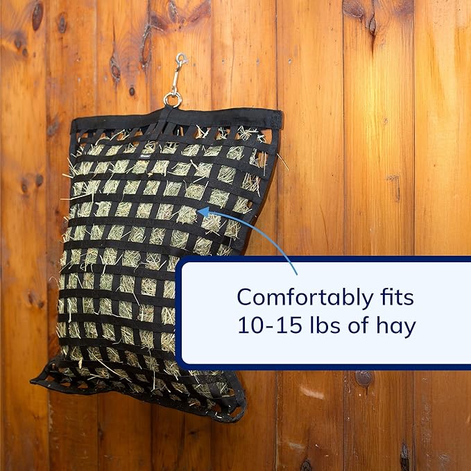 - Easy Loading: The slow feeder bag’s gator mouth enclosure ensures the hay stays firmly in place; The 4-flake size can easily hold up to 10-15 lbs of hay, ensuring your horse can feed easily and constantly, especially useful when stall-bound