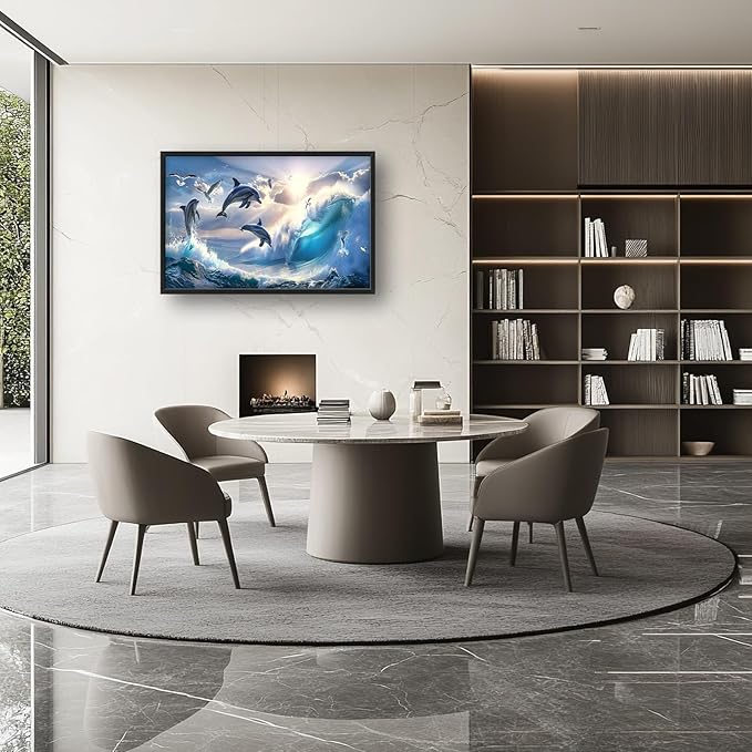 - 【Unique Design】A majestic ocean scene with graceful dolphins leaping out of the water, surrounded by glistening waves and seagulls soaring in the sky, in the style of 3D Realistic.