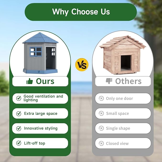 - VENTILATED AND THERMOSTATIC DOGHOUSE: The outdoor dog house roof top and window ventilation system helps fresh air circulation, and the innovative heat balance feature protects your pet in cold weather and keeps it cool in hot environment.