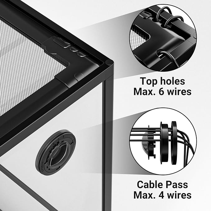 - 【Top Screen Ventilation】The removable wire top screen provides plenty of ventilation for optimum airflow, allows full spectrum, UVB and IR light penetration. It also has pre-drilled wire entry holes for easy organization of wires and tubes.