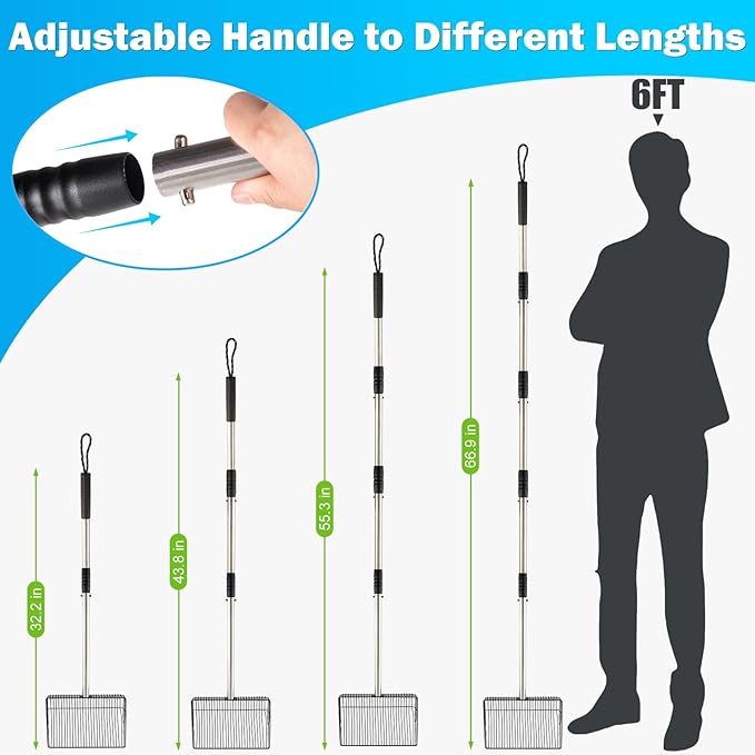 10 inch Large Chicken Poop Scooper,4 in1 Chicken Coop Poop Shovel,Adjustable 32" to 67" Stainless Steel Chicken Coop Scoop,Litter Sifting Shovel Poop Scooper for Chicken Coop Pet Waste