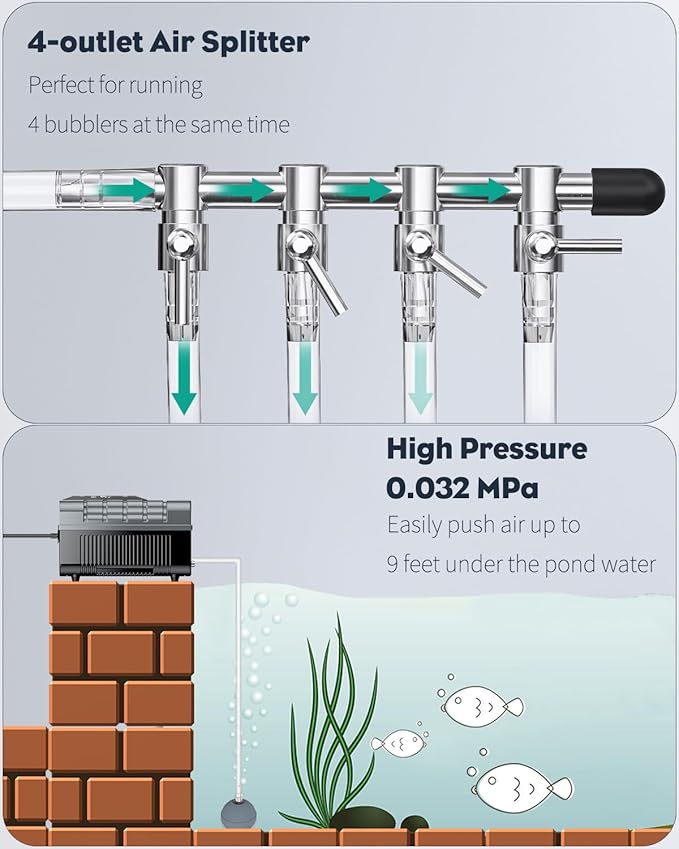 - Enhance Pond’s Vitality: The pump pushes air into bubblers and quickly diffuses oxygen throughout the pond. Promote the movement of water surface to avoid freezing in winter. Excellent for fish’s breath or roots’ growth.