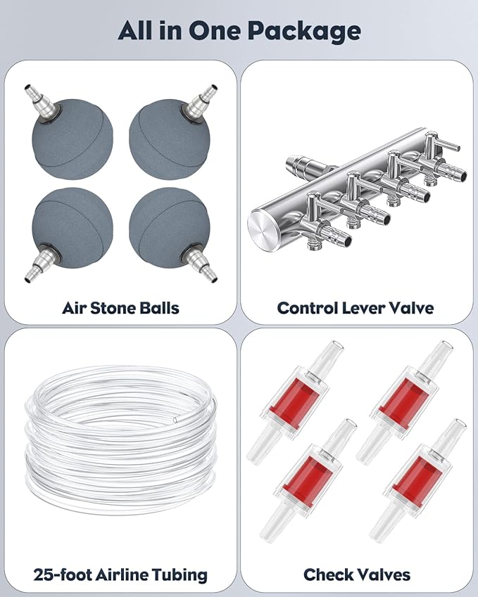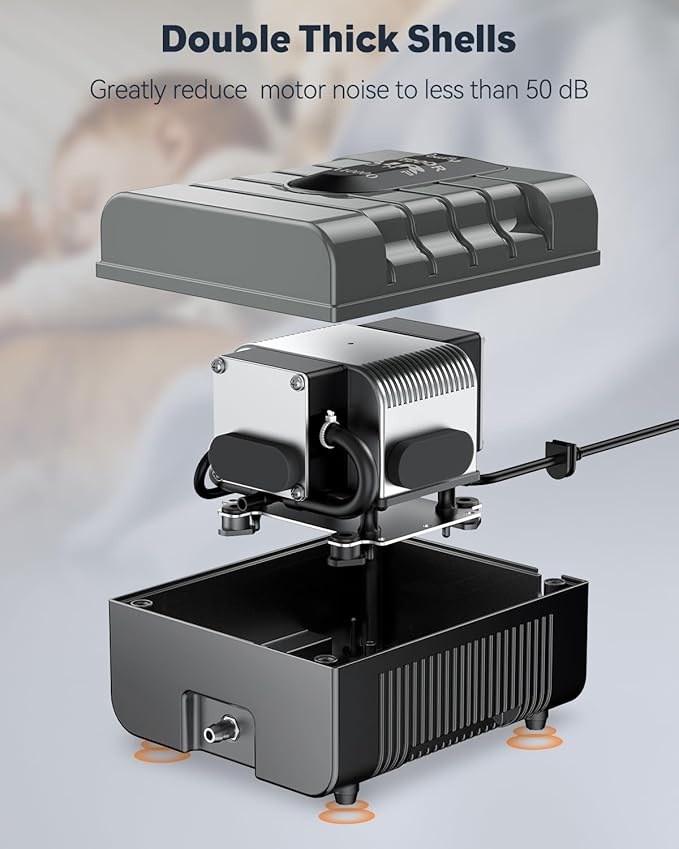 - Reliable Construction: With 2-layer thick shells, the outdoor oxygen pump is heavy-duty and effectively shields motor noise to 50 dB. And the 4 shockproof rubber feet greatly minimize vibration for steady air flow. Dependable to endure continuous running 24/7.