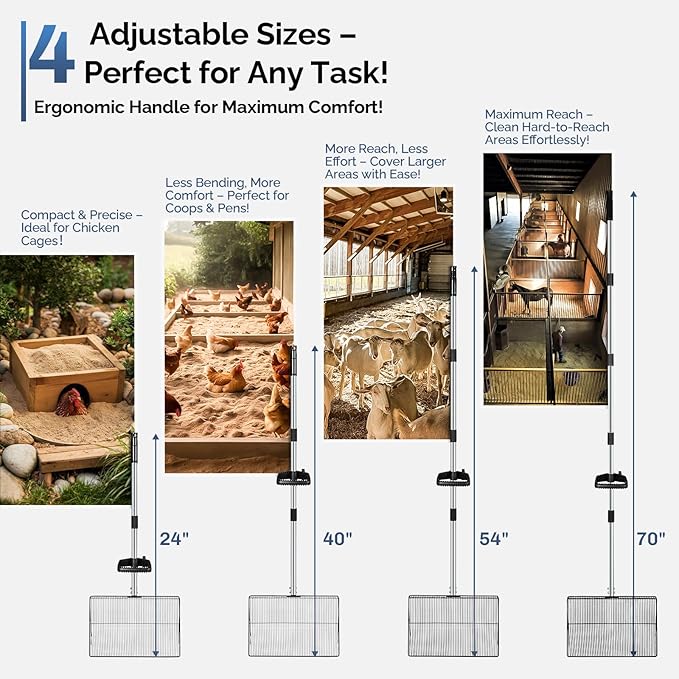 - 𝐄𝐫𝐠𝐨𝐧𝐨𝐦𝐢𝐜 & 𝐀𝐝𝐣𝐮𝐬𝐭𝐚𝐛𝐥𝐞 𝐋𝐨𝐧𝐠 𝐇𝐚𝐧𝐝𝐥𝐞 – 𝐒𝐚𝐯𝐞 𝐘𝐨𝐮𝐫 𝐁𝐚𝐜𝐤: The handle extends from 24 to 70 inches, allowing for adjustable length based on your height. Our Hdnbsp chicken coop cleaning tools can be adjusted to four different specification sizes: 24 inches, 40 inches, 54 inches, and 70 inches. Say goodbye to bending over and back pain while cleaning your chicken coop, goat stalls, or horse barns. Clean standing up with ease!