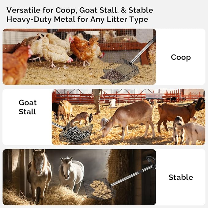 - 𝐌𝐨𝐫𝐞 𝐭𝐡𝐚𝐧 𝐣𝐮𝐬𝐭 𝐚 𝐜𝐡𝐢𝐜𝐤𝐞𝐧 𝐬𝐜𝐨𝐨𝐩𝐞𝐫: This multifunctional chicken pooper scooper works in chicken coops, goat stalls, horse stables, and more. The sturdy stainless steel construction handles all types of litter and waste. Perfect for cleaning sand, hay, or bedding, and also great for sifting cat litter, raking pine shavings in rabbit hutches, or cleaning dog kennels. The angled edges glide easily through packed bedding, grass, and gravel.