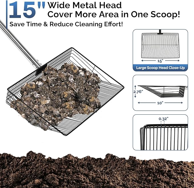 - 𝟓𝟎% 𝐖𝐢𝐝𝐞𝐫 𝐓𝐡𝐚𝐧 𝐒𝐭𝐚𝐧𝐝𝐚𝐫𝐝 - 𝐂𝐥𝐞𝐚𝐧 𝟑𝟎% 𝐅𝐚𝐬𝐭𝐞𝐫 𝐢𝐧 𝐋𝐚𝐫𝐠𝐞 𝐂𝐨𝐨𝐩𝐬: Dominate big cleanups with our 15-inch chicken coop scooper – 50% wider than standard 10-inch models! Sift 2x faster in deep litter, sand, or hemp bedding. Clean a 200 sq.ft coop in 15 minutes (vs. 25+ mins with smaller scoops). Farmers’ #1 time-saver!