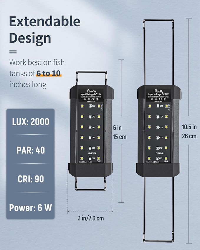- For 6" to 10" Tanks: Equipped with an extendable bracket (min length: up to 6"; max length: up to 10.5"), the aquarium lamp always stays steady on the fish tank. Work best on tanks of 6 to 10 inches long
