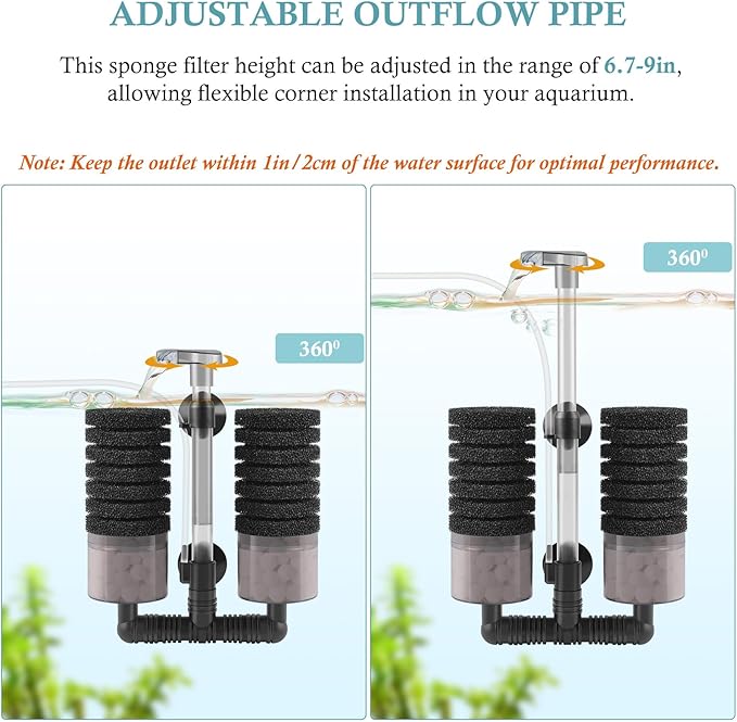 - Adjustable Filter: Easy to adjust the height of the filter with the telescopic water outlet pipe, and the direction of water outlet can be rotated by 360°. For different tanks, you can choose to install this fish tank filter horizontally, vertically. You can also rotate the bottom black pipe to install the filter section at different positions, which makes this bio sponge filter more convenient to use.