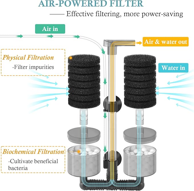 - Ultra-Quiet Air Powered Filter: This aquarium sponge filter needs to be connected with an air pump to drive the filtration process (air pump is not included in the package). Airflow will drive the water to flow through the filter material, thereby achieving the filtration effect, which is more power-saving. Moreover, when the filter is in operation, only the sound of water flow can be heard, without the noise of the motor, making it very quiet.