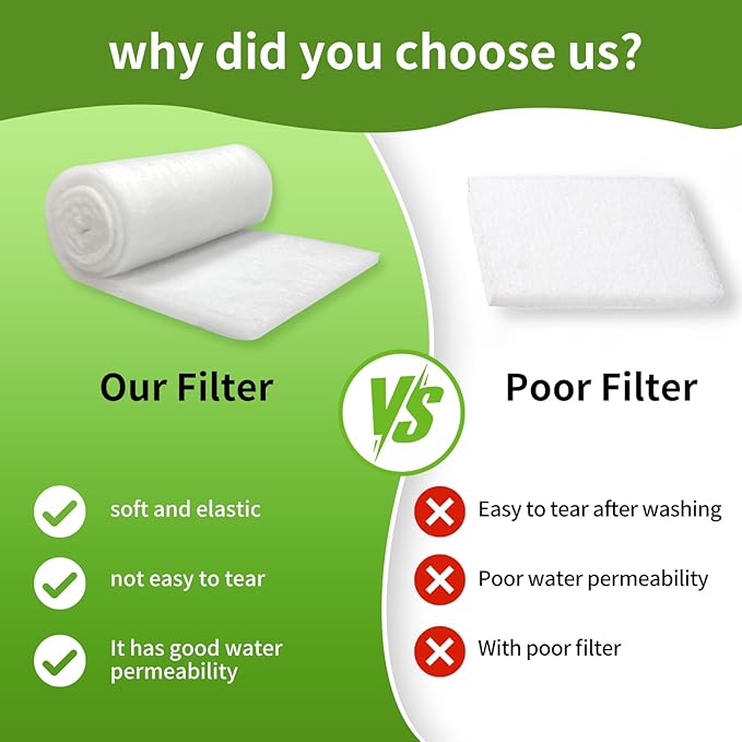 - Universal Compatibility: Fits all filter systems, including canister, hang-on-back, and sump filters. Trim our aquarium filter floss effortlessly to match unique tank sizes and filter shapes.
