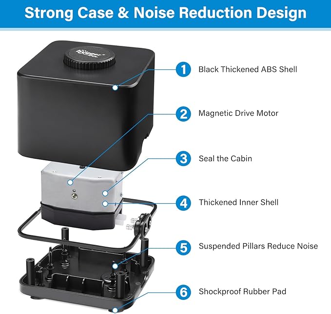 - Quiet Aerator Pump: hygger aquarium bubbler pump is designed with advanced noise reduction technology, featuring a double-layer structure and thickened ABS shell to minimize motor noise, four shockproof rubber pads, it operates at a maximum of 35 dB, perfect for bedrooms, living rooms, or offices, it ensures a tranquil environment without disturbing your daily life.