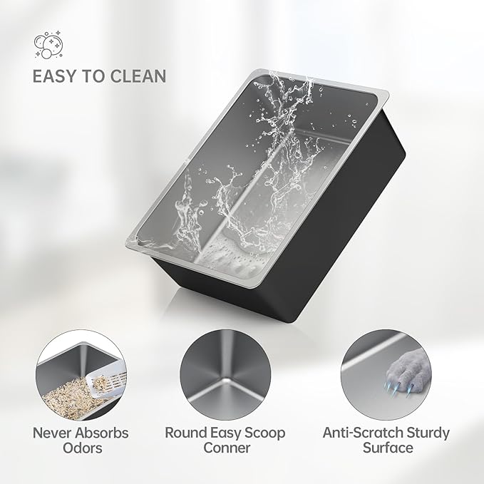 - Safe Round Edges: The surface of the large stainless steel litter box has been carefully polished to ensure that its smooth, rounded edges are safe for your cat. The metal litter pan is lightweight and easy to lift, so you won't need to worry about injuring your hands. This kitty litter box is engineered for stability, even when filled with heavy litter, making the task of scooping cat litter effortless. Its construction resists scratches from cat claws or litter scoops and minimizes dents.