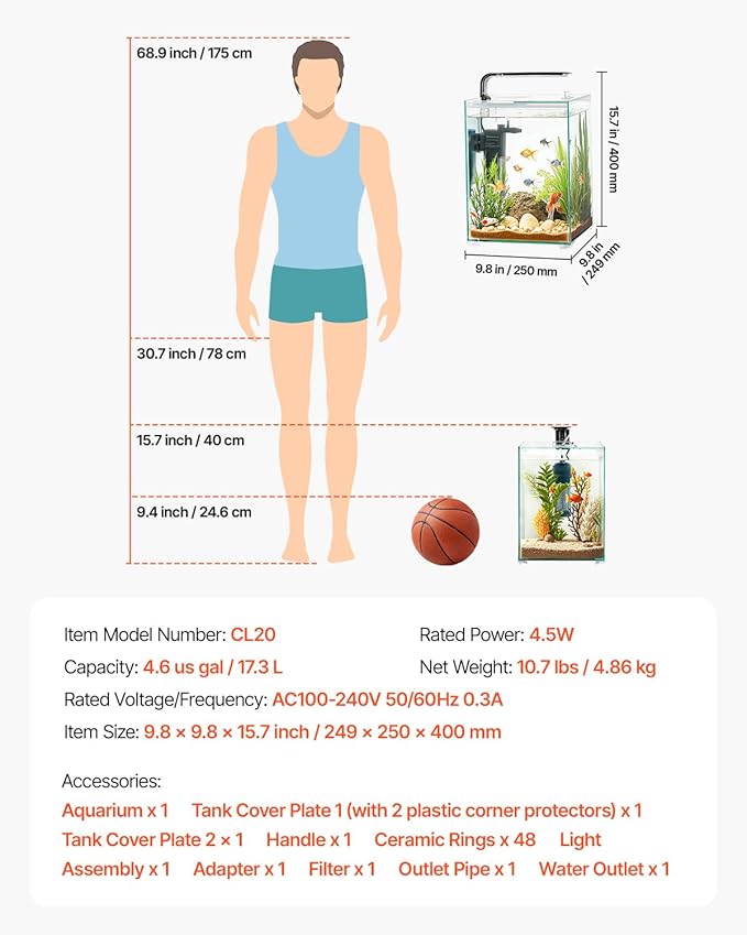 VEVOR Fish Tank Aquarium, 5 Gallon Square Ultra-Clear Glass Starter Smart Tank Adjustable 3 Color Lighting, Self Cleaning System Fishbowl for Freshwater & Saltwater Fish Home, Office, or Pet Use