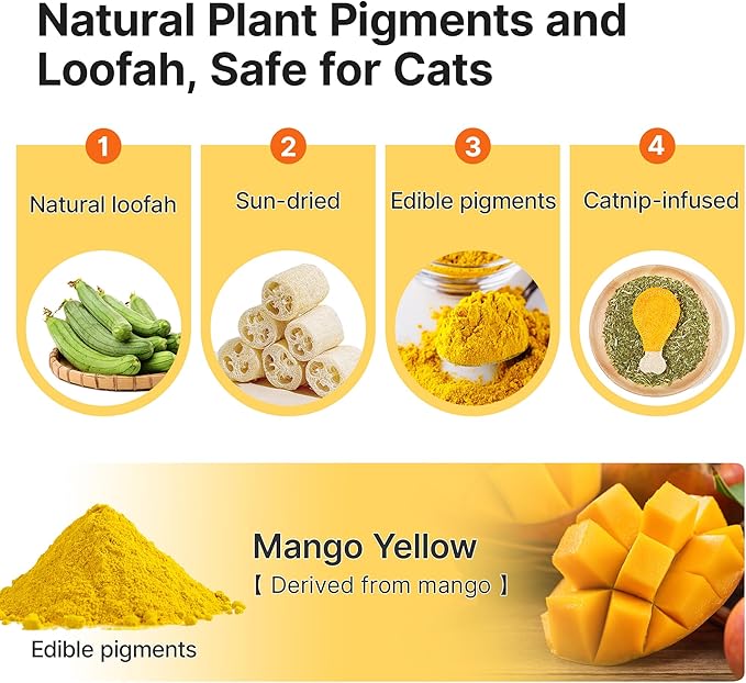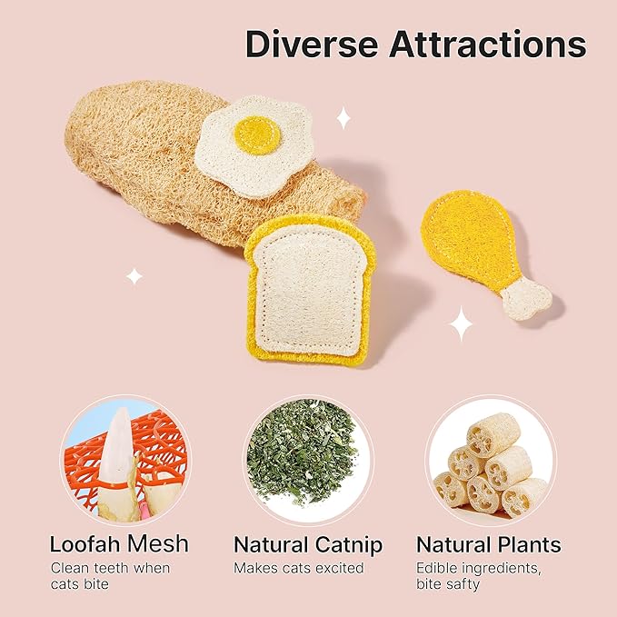 - Safe & Digestible Chew Experience: Made from non-toxic, digestible materials, these loofah toys are safe for your cat to chew. The sturdy yet gentle design ensures they can withstand chewing, while also breaking into small, harmless pieces if swallowed. Perfect for cats who enjoy biting but need a safe option for their dental care and chewing needs.