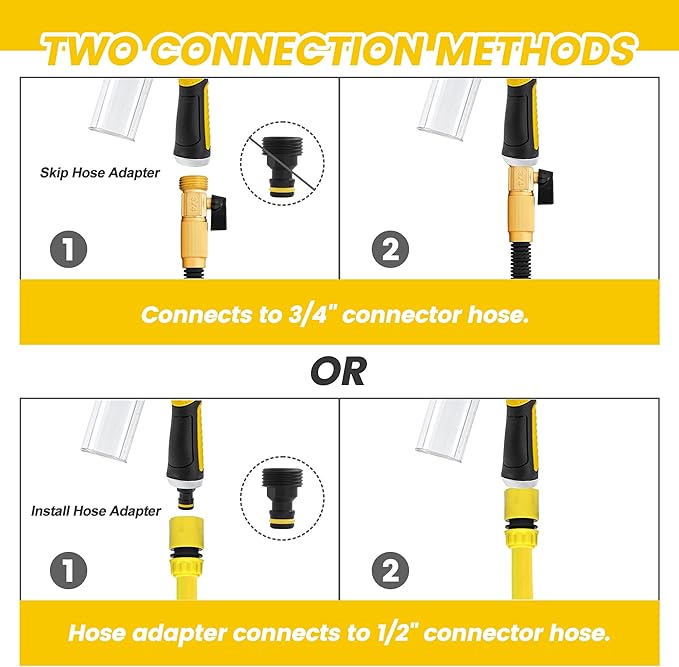 - 【Wide Application Hose Nozzle 】 The washing spray nozzle comes with quick connector ports and rubber gasckets, fits any standard garden shower water hose, you can easily connect it with your garden hose, The foam sprayer is made of high-grade plastic, this garden hose nozzle is easy to grip, slip-resistant and comfortable fit