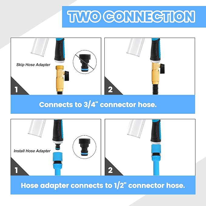 - 【Wide Application Hose Nozzle 】 The washing spray nozzle comes with quick connector ports and rubber gasckets, fits any standard garden shower water hose, you can easily connect it with your garden hose, The foam sprayer is made of high-grade plastic, this garden hose nozzle is easy to grip, slip-resistant and comfortable fit