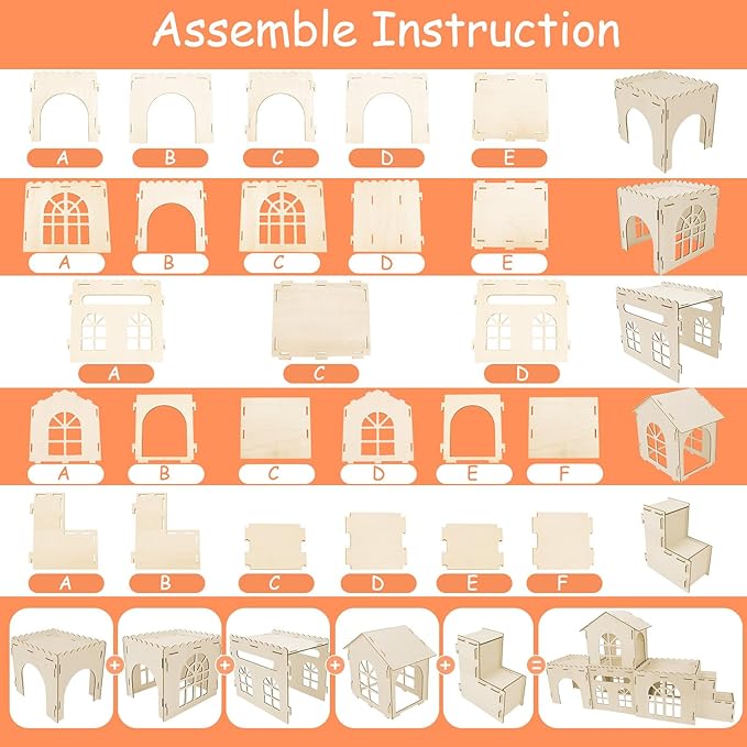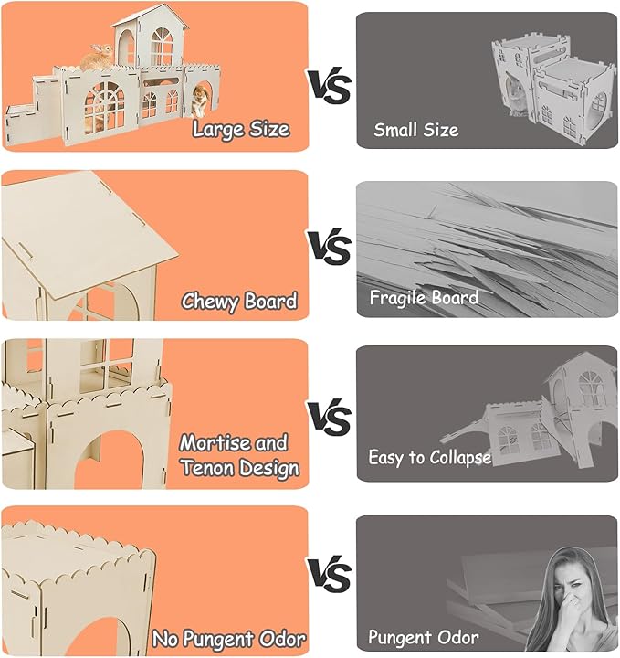 - Easy to install: Our castle is nail free installation; The bunny hide consists of 25pcs wooden boards and 34pcs rubber bands totally; Each package comes with a detailed instruction manual, which includes an installation tutorial for the 4 independent rabbit house on one side and the assembly process for the large castle on the back, making your installation easier
