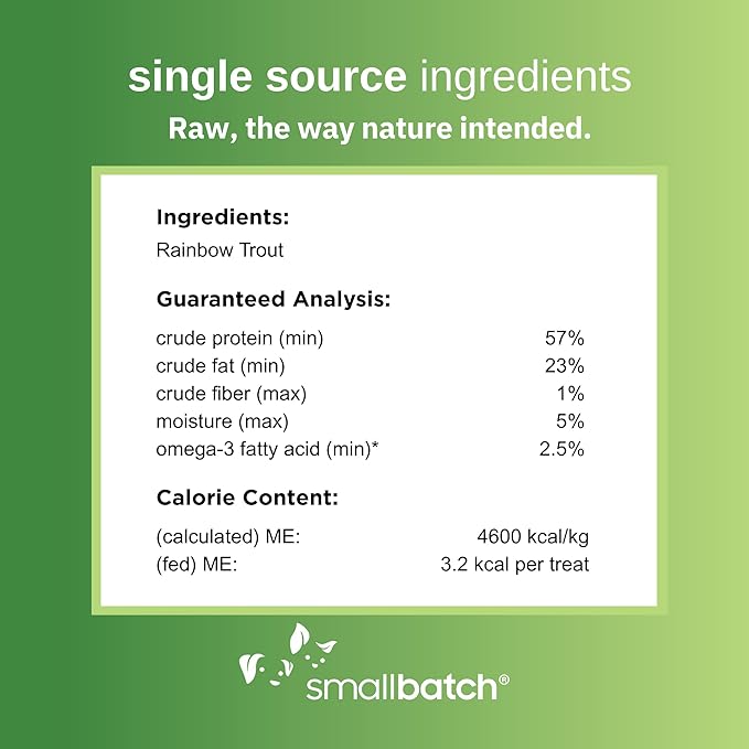 - 100% Single Ingredient Fish Treats: These light, crispy treats for dogs and cats are made from 100% pure Rainbow Trout. Each Smallbatch Pets treat is freeze-dried to lock in natural nutrients.