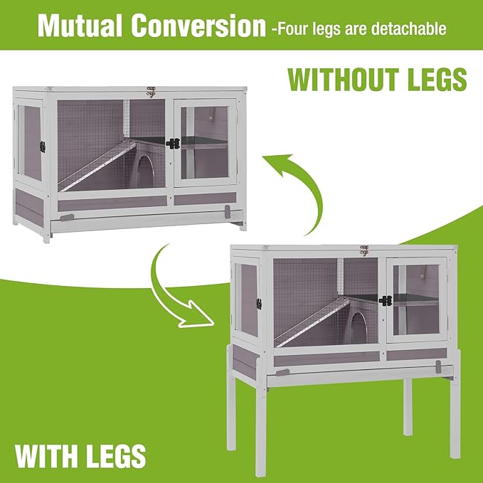 GUTINNEEN Rabbit Hutch Guinea Pig Cages Indoor with Stand Wooden Small Animals Cage Hutch Hamster Cage with Hideout,Pull Out Tray, Anti Chew Ramp (Grey)