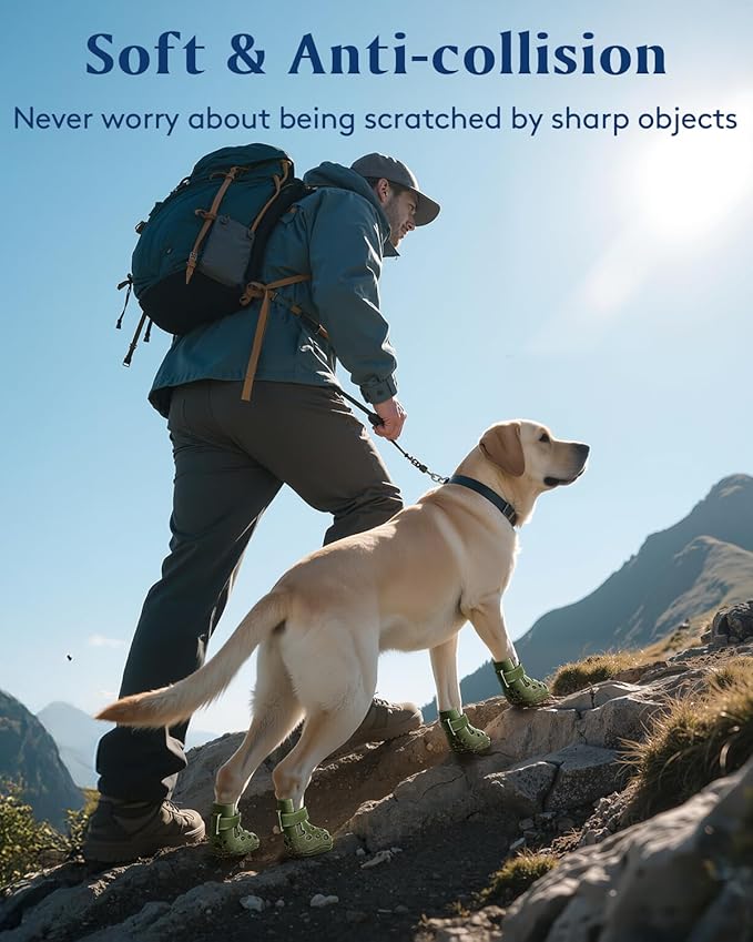 - ANTI-SLIP:The silicone material make the dog booties for hot pavement are soft, light, comfortable and anti-slip. The sole is designed with reference to human football sole particles, so the dog booties can provide stability and grip, help dogs stand firmly and walk freely on slippery/wet surfaces, they can be used as dog snow boots, dog rain boots, dog recovery boots.